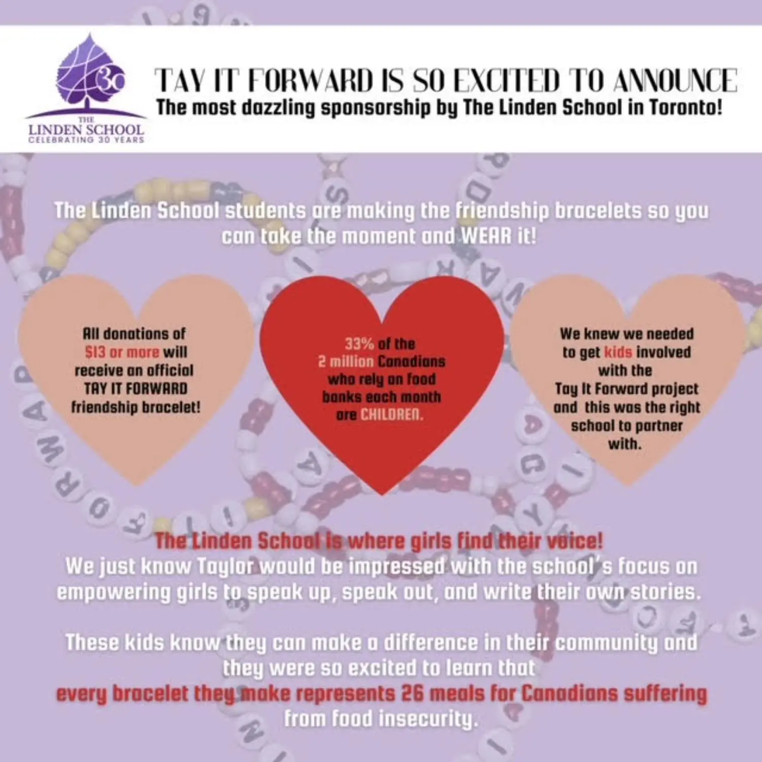 Your gift of $13 (or more!) provides 26 meals through Food Banks Canada — 13 being Taylor’s favourite number. Donors will be sent an official Tay It Forward friendship bracelet, lovingly made by Linden students. Food Banks Canada will ship the bracelets across Canada. Bracelets will be mailed out after December 13.